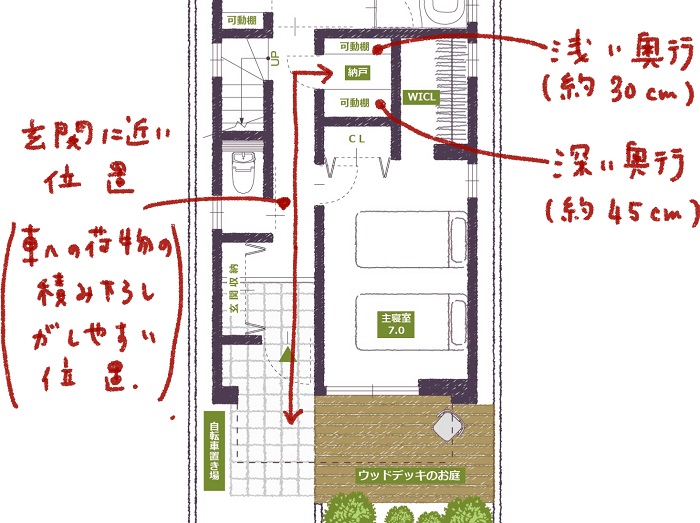 当然、共有部分にも十分な収納が必要です。可能な限り、玄関まわりには大きな納戸を計画したいです。